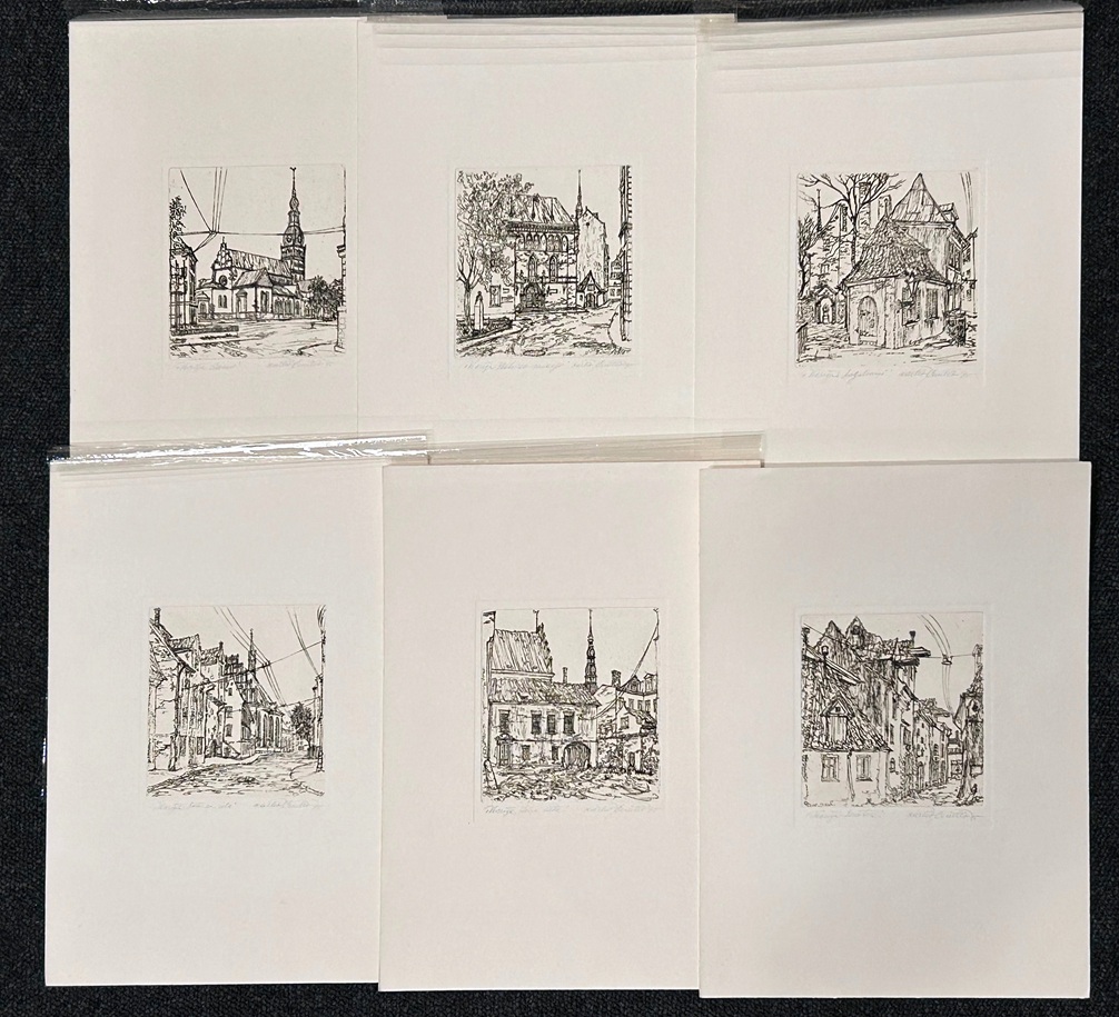 Sešas grafikas "Vecrīga", 1975., papīrs/oforts, darba izmērs 11 x 10,5 cm, loksne 26 x 20,2 cm.