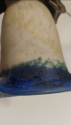 Iegravēts paraksts stiklā "La Verre Francais ( tulk. franču stikls)". Francija, 1920-1940., stikls/metāls, darba kārtībā.