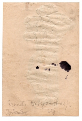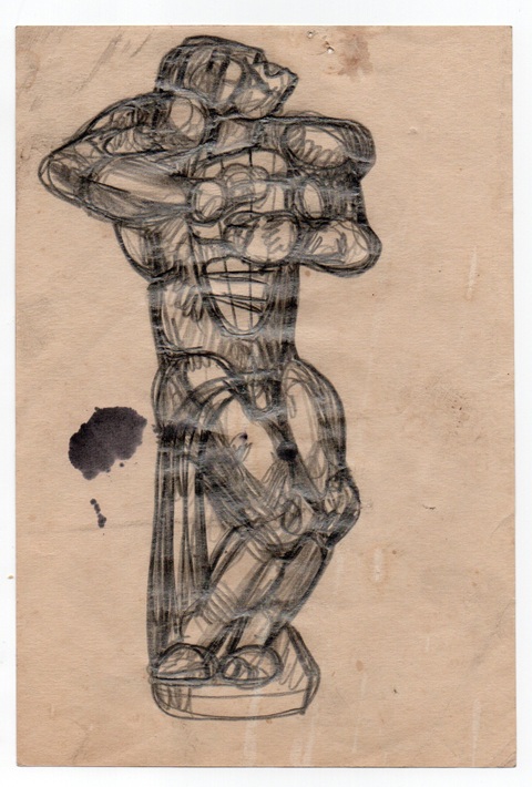 "Figūra". 1965., papīrs, zīmulis, 18.7 x 12.7 cm. Darba aizmugurē mākslinieces Džemmas Skulmes (1925 – 2019) roku rakstīts teksts "Ernests Ņeizvestnijs. 65.g.", (ar zīmuli) un mākslinieces paraksts